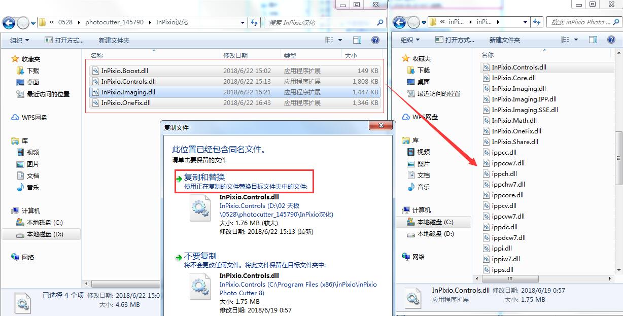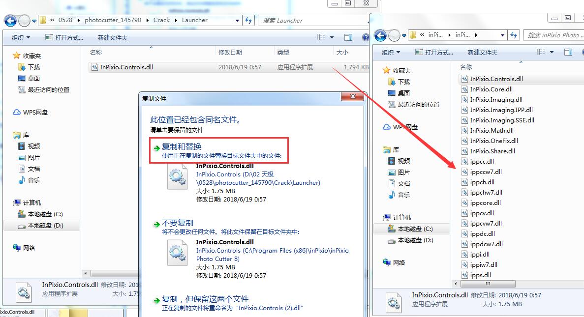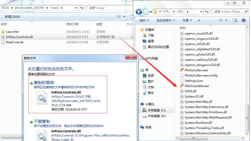 6、再将Crack中Launcher文件夹中的"InPixio.Controls.dll"拖至原程序的启动文件夹中,并选择"复制和替换"即可。