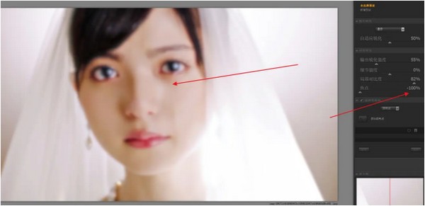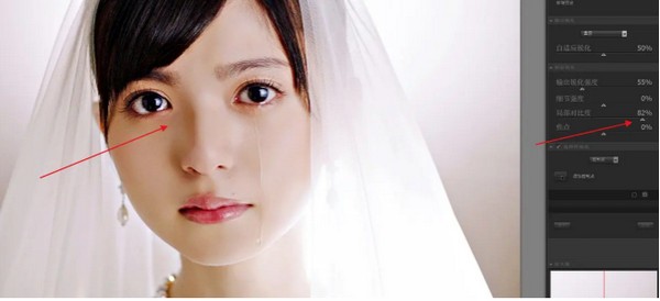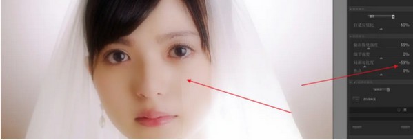 2、第二个滑块为锐化区域和锐化边缘,顾名思义,往左滑动是对画面的大块区域进行锐化,比如图中的脸,而向右滑则是对画面边缘的部分进行锐化,比如图中婚纱的外轮廓。