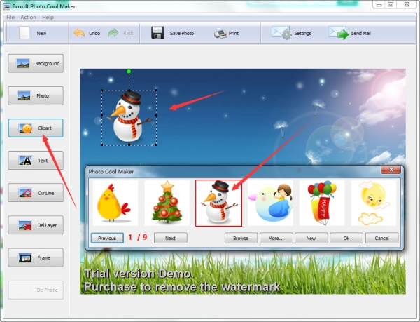 Boxoft Photo Cool Maker提供了一体化的界面,让您轻松制作独特的照片。有了它,你可以嵌入惊人的背景,添加卡通装饰,和装饰与漂亮的框架,所有的只是几个点击。