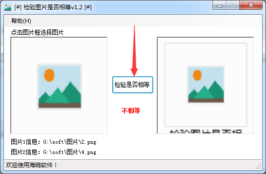 海鸥检验图片是否相等绿色版是一款简单实用的图片检验软件,海鸥检验图片是否相等绿色版所有功能集成在同一界面实现,当您遇到了两张图片无法判断是否相等的时候,就可以使用这个工具进行检测,支持jpeg、bmp、png、gif等格式。