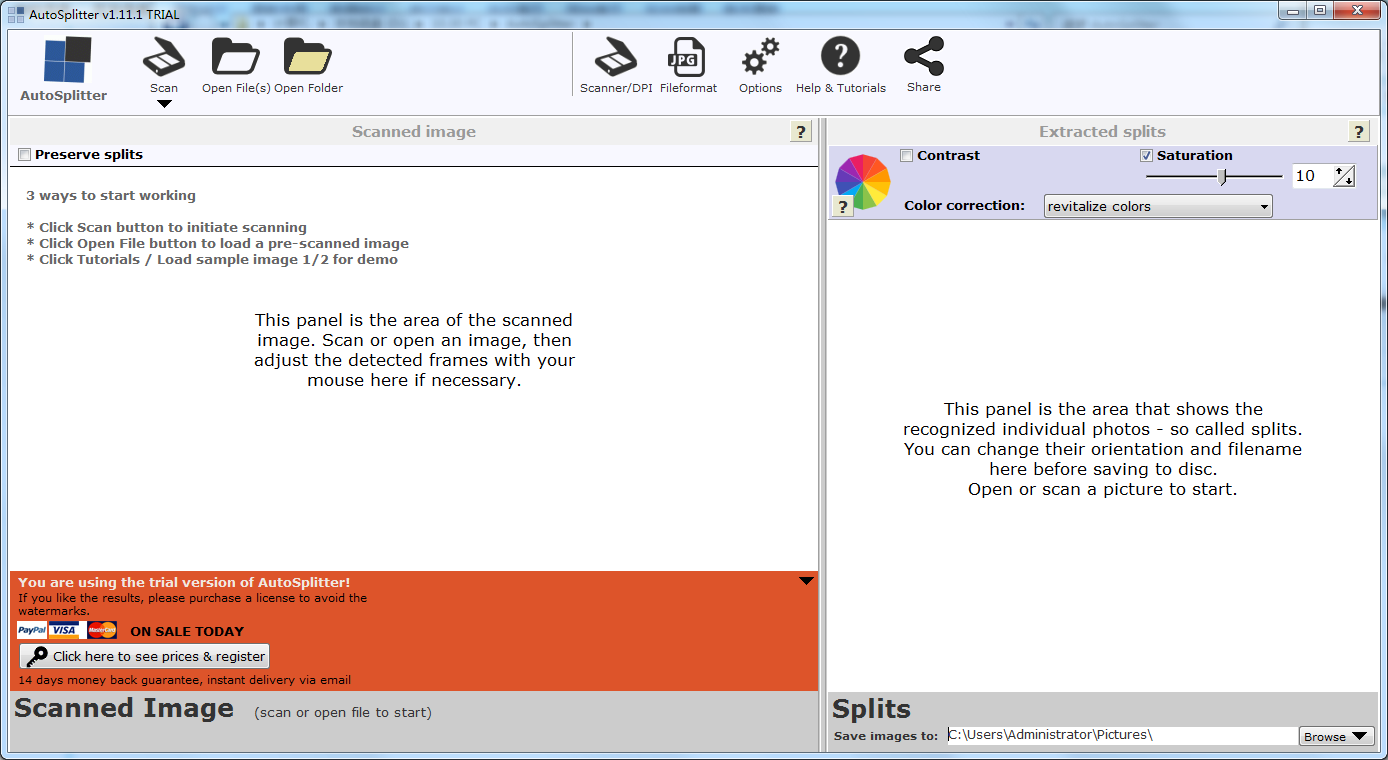 AutoSplitter官方版使您能够上传已扫描的JPG文件,或使用合并的扫描工具。后者允许您选择一个连接的设备和质量,从300 dpi到1200