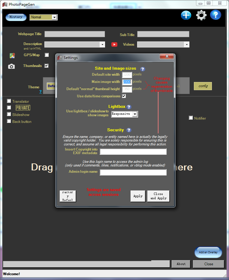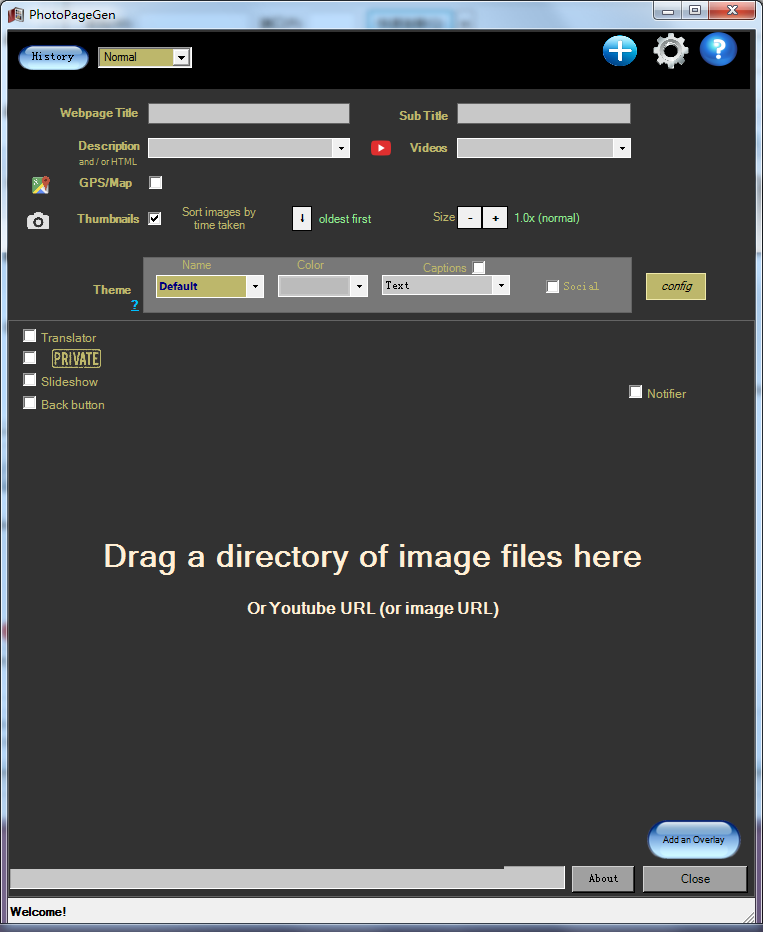 PhotoPageGen官方版有一个在一个窗口中包含所有选项的界面,您可以轻松创建图片库,只需拖放包含所需照片、图像的url或youtube