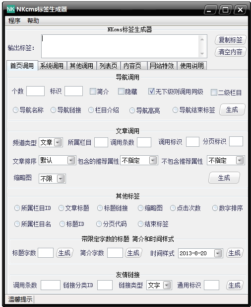 NKcms标签生成器官方版是一款简单方便的网页制作标签生成器;NKcms标签生成器官方版也是针对DOYOcms标签进行快速的美化生成使用,还可对首页调用进支持,包括了系统的试验,内容页的选择使用等;软件友好的操作界面,让用户可以更加快捷的了解熟悉软件,也支持将快速的对您需要的功能进行设置使用,还可清除您不需要的内容等等。
