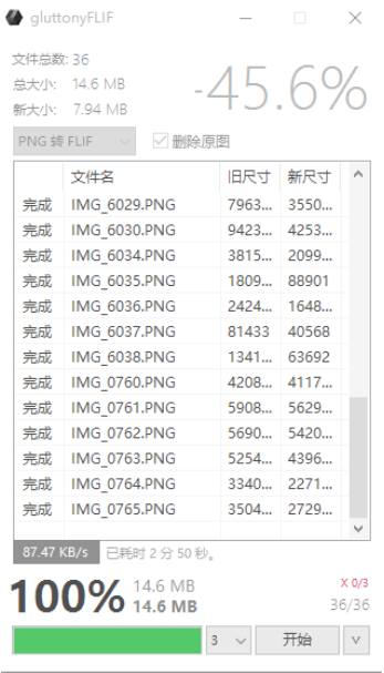 ??gluttonyFLIF不仅可以显示转换的进度百分比,还可以实时显示转换速度(M/s)、预计剩余时间、当前线程数、实时体积减少比例,如同下载工具一般,能够方便的了解转换任务的进展。