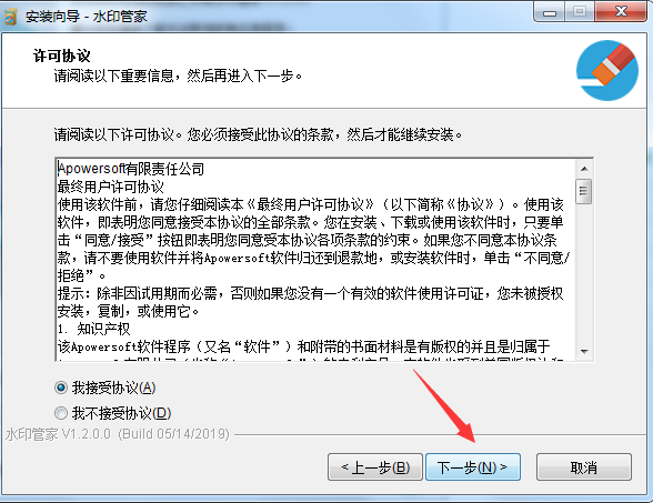 4、阅读软件的相关许可协议,阅读完成后选择【我接受协议】,然后点击【下一步】继续安装此程序。