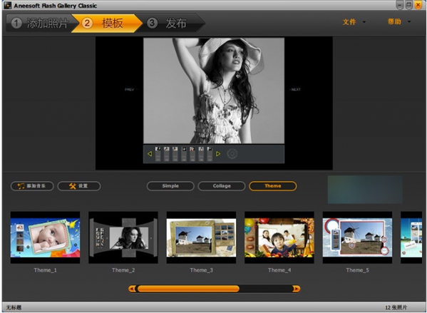 2、选择模版:有简约、拼贴和主题三种类型的模版,可根据自己的需要选择,简单实用的此外还可以添加音乐和设置模版,