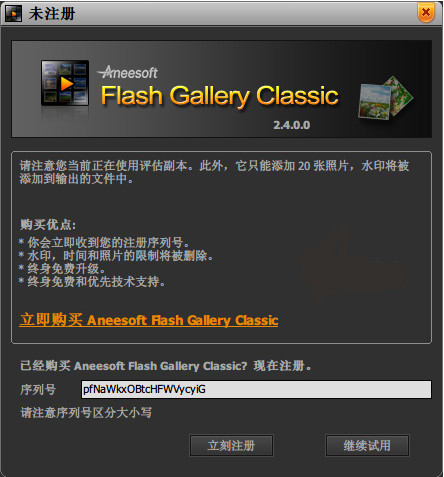 弹出的窗口输入序列号( 序列号:pfNaWkxOBtcHFWVycyiG ),然后点击“立刻注册”,看到注册成功的提示,说明软件已经注册并可以正常使用了。