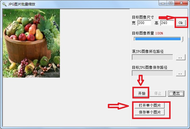 6. 如果只想缩放单个JPG图片,则先点击“打开单个图片”按钮,再点击“保存单个图片”按钮即可,目标图片的尺寸及质量设置同上。