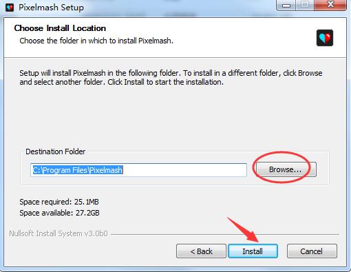 4.设置安装位置,默认的是C:Program FilesPixelmash,可以点“browse”另行设置,之后点“install”开始安装