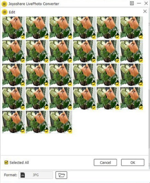 之后,您有权使用“播放”按钮播放实时照片,或者在指定文件后面使用“编辑”按钮选择所需的帧。确认选择后,继续按“格式”面板选择所需的输出格式,如JPG,GIF,BMP,PNG等。此外,分辨率和质量可以自行调整。或者您可以决定是否保持纵横比。