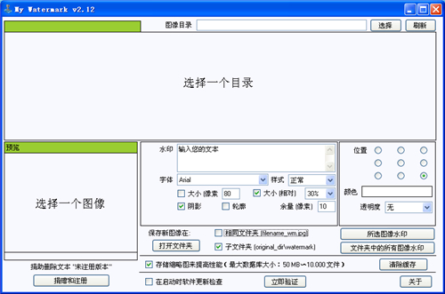 My Watermark汉化版是一款快速高效的图片添加水印的软件,非常的方便。可以快速的给整个文件夹添加文字或者图像水印,可以自定义水印的各种显示细节,软件支持批量添加水印到图片里面,汉化作者已经去除了自动下载数据、去了除水印,可以放心使用。
