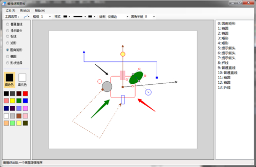 ??爱搜呀画图板官方版是一个实用的截图、画图程序,可以帮助用户实现直线、折线、矩形、椭圆、指示箭头等规则形状,它是用C#/Winform/GDI+实现的类似mspaint的画图程序,其制作的形状被绘制后,不会像mspaint那样,就动不了了,而是可以再次被编辑,包括旋转、缩放等。