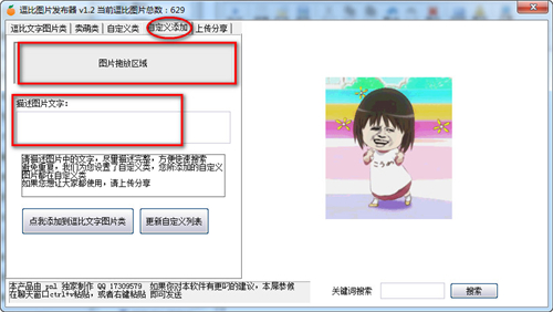 3、自定义添加,可自己制作属于你的图片表情,只需把图片拖到指定区域,加上描述的文字,就可直接添加到逗比文字图片类。