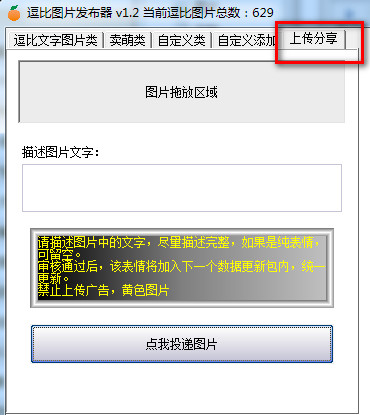 4、上传分享,可将自己制作的图片表情上传到逗比图片发布器上,让更多的人看到你做的表情图片。