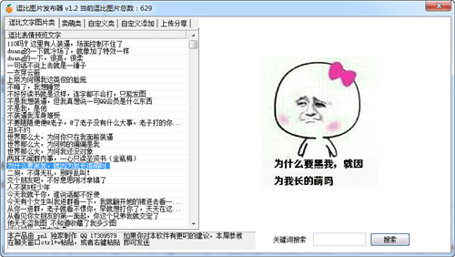 逗比图片发布器官方版是一款数据丰富、界面友好的逗比表情包生成工具,它能帮你制作出各种带文字的逗比表情图片,还在羡慕好友的各种逗比图片吗?别羡慕啦,这款逗比图片发布器帮你自制表情!个性DIY,自动生成搞笑图片,就是这么时尚!