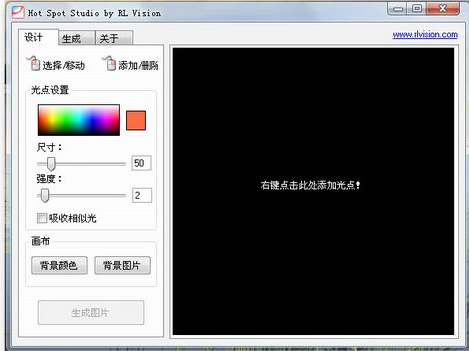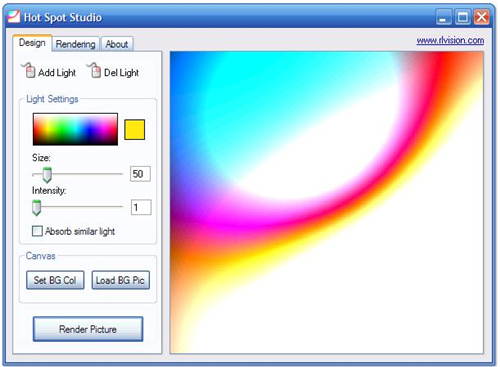 ??Hot Spot Studio 是一款颇具有创意的图片编辑软件,Hot Spot Studio 可以轻松创造出具有聚光灯效果的迷离感十足的图片效果。Hot Spot Studio 的使用方法非常简单,你可以通过右键添加或删除大光斑,而后再用左键移动其所在位置;然后调整尺寸和强度;载入背景颜色或是图片;最后点击生成图片即可。
