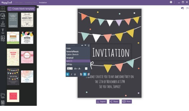 完成您的杰作后,您可以将其打印出来,以PDF,JPG,PNG或BMP格式导出,或通过应用程序获取分享链接。