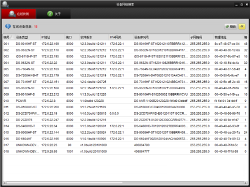 SADPTool官方版软件启动之后,每 15s 向电脑所在的局域网内发送一次广播包,侦测所有设备的在线状态。所有在线设备的设备类型,端口号,ip 地址,软件版本等信息将会显示在“在线侦测”界面上。
