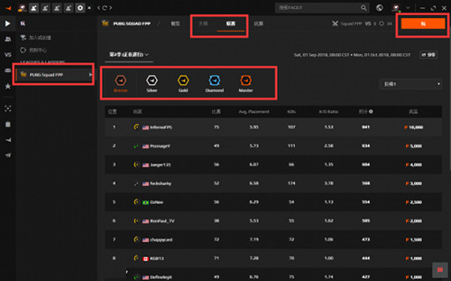 接下来组上队伍,就一定要注意了!一定要按照PUBG SQUAD FPP --- 点击天梯/联赛 --- 选择你的分段 --- 右上角“玩”的顺序来,不选天梯或者联赛,再点右上角玩的话,是普通匹配模式,不加天梯/联赛分的!
