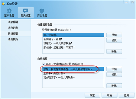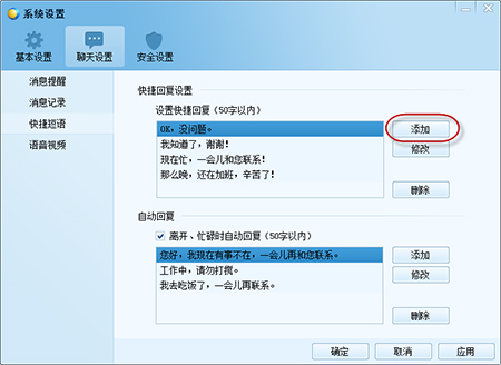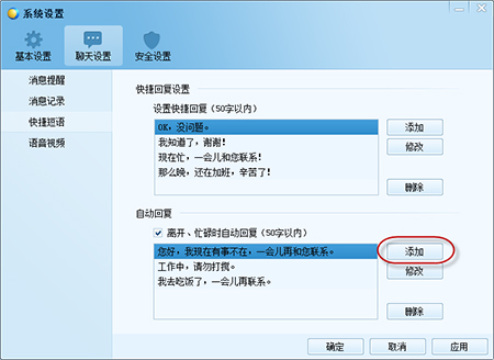 在系统设置=》聊天设置=》快捷短语中输入您要加入的内容点击添加即可添加新的自动回复内容了。