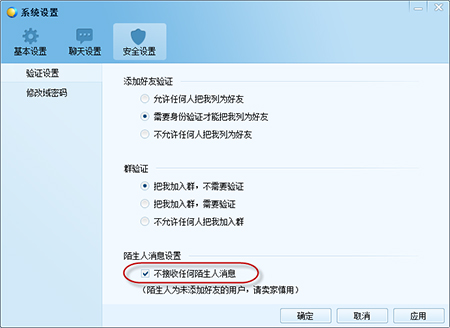 右键该联系人,在弹出的菜单中选择“删除好友”。在系统设置=》安全设置=》验证设置里,选中“不接收任何陌生人消息”即可。