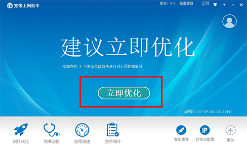 2、运行客户端软件“宽带上网助手”,软件默认显示为“立即优化”主界面。可进行一键式网络优化,并提供网络质量问题修复功能。