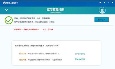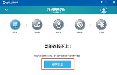 1、(以有线网卡被禁用为例)运行客户端软件,选择【故障诊断】,客户端自动进入网络检测流程,提示网络连接不上,点击【断网急救】,进入故障检测。
