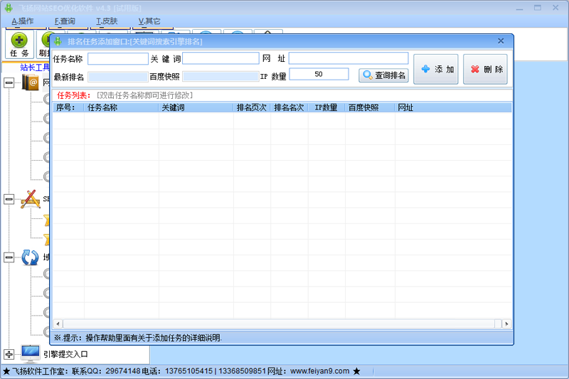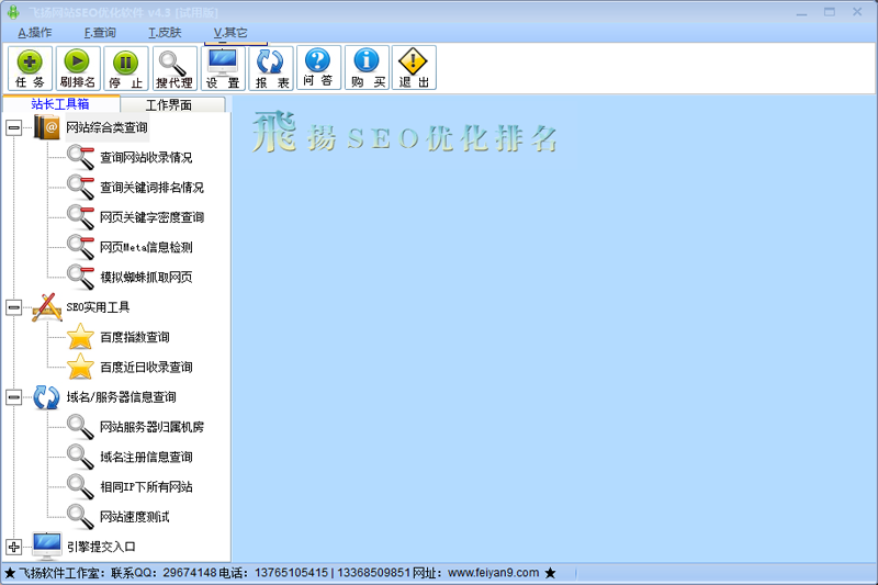 飞扬网站SEO优化软件是对搜索引擎进行模拟化人工操作的一款SEO工具,通过每天引入一定数量的独立IP,全自动模拟手工在引擎中搜索关键词(非模拟来路模式)。从而达到提升关键词排名的效果。软件内置两种获取IP的方法:即常见的ADSL拔号自动换IP与及搜索大量的代理IP来换IP,通过两种不同的IP来源式,可以更大程度上的模拟真实手工搜索。