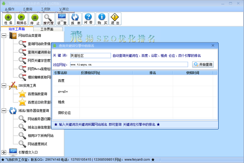 5、查询排名:输入关键词与网站域名即可查询到在百度、GOOGLE、雅虎三个网站上的关键词排名最多可查询100页内。