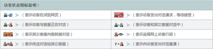 当访客处于不同的状态(浏览网站、请求对话、和我对话等等)时,相应行左侧就会显示不同的图标进行标识。当用户在行上面双 击鼠标时,触发的行为将取决于访客所在的状态,下面的表格列举出了这种对应关系: