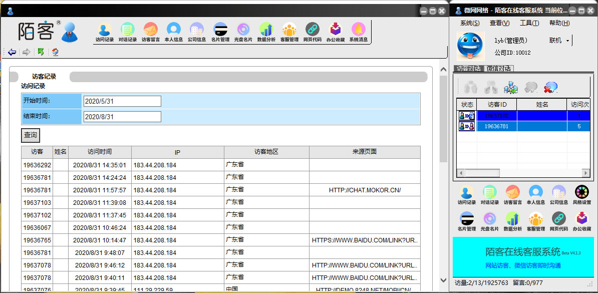 该栏可以查看与访客的对话聊天记录。历史对话(什么时候访问,访客所在的地理位置)可以让客服实时了解到访客在网站上的