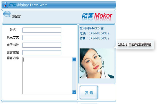 用户根据自己的需要对各项设置完后,点击“应用”按钮,即可生效。访客端点击离线图标进行留言时,直接进入系统默认留言窗口进行留言。