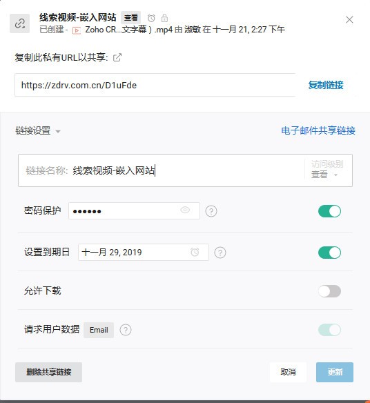 共享文件给别人的时候,对方不一定要有Zoho帐号。比如“公司下一年发展规划”要发给投资人看,就可以对这个文件生成多个URL链接,分别发给不同的人看,还可以对共享文件设置到期日、禁止下载、强制对方填写其个人信息才能查看等等。