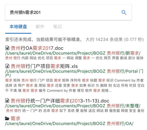 支持全文搜索 Word、Excel、PPT、PDF、TXT、MD 等文档内容 支持搜索 Zip 压缩包内文件名