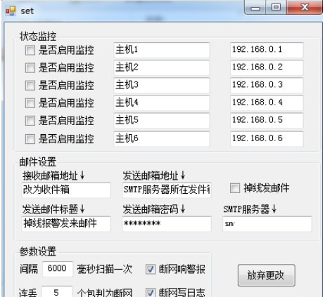 作者用C#编的一个小程序,用于监控某些主机是否在线,如果在设定的条件内不在线,则有“网络故障,请检查”的提示音。