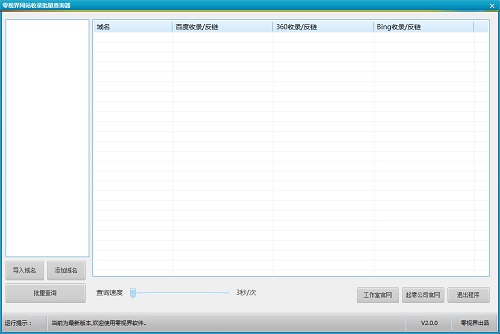 1、打开零视界网站收录批量查询器绿色版,导入域名,或者直接手动输入需要查询的域名,然后点击【批量查询】按钮即可