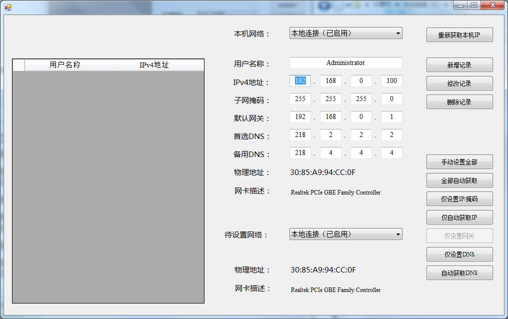 2.中间区域上部分为ip信息显示区域,如果选择上面本机网络则显示本机ip,如果点选左侧列表则显示列表内存储的ip信息,显示本机信息时,用户名为当前电脑用户名,存储时只作为区别不同ip使用,不会影响被设置电脑的用户名
