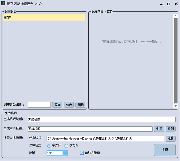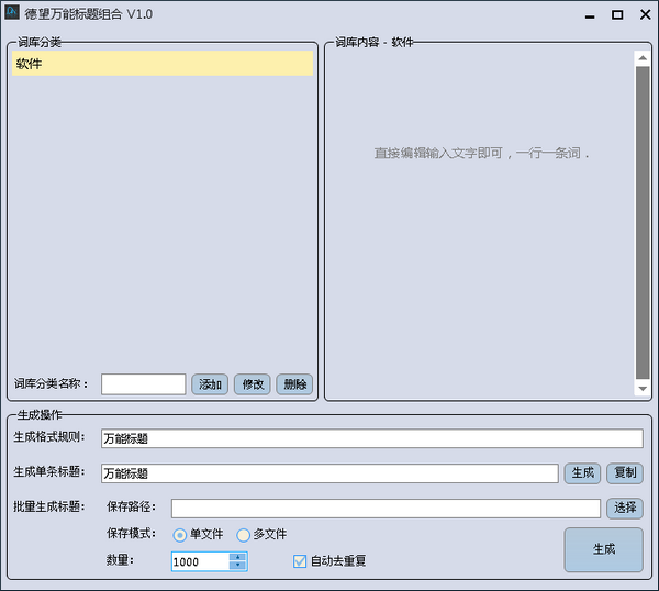 德望万能标题组合绿色版是一款非常好用的自动生成标题软件,很多做SEO的用户都知道,关键词是非常重要的,因此需要用户对关键词的组合有一定的了解,通过德望万能标题组合用户就能轻松的针对关键词进行自动生成,只需要事先导入你所需要的关键词,软件会根据词库自动生成各种各样的组合。