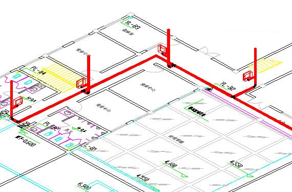 消火栓布置连接,沿线、墙对象布置消火栓,进行立管连接消火栓。