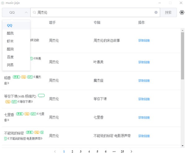 首先搜索歌曲或歌手名,支持QQ、酷我、虾米、酷狗、百度、网易多个平台