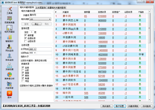 关键词分析是搜索引擎优化的基石,相关关键词是拓展网站关键词的利器。本功能会根据你输入的关键词全网拓展,并且提供关键词的百度指数和百度谷歌收录量。不但能轻松的让你拥有海量词库,还会让你对关键词的质量一目了然,做到轻松筛选关键词。