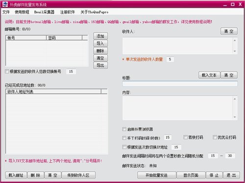 外虎邮件群发系统软件官方版是一款用户界面直观清新,非常便捷易用的邮件营销广告软件。适用范围广,功能强大。易于上手,十分实用和方便。将日常使用的免费邮箱作为服务器,模拟人工发送机制,速度快还不会被系统识别,不会发送成功就进入垃圾箱。