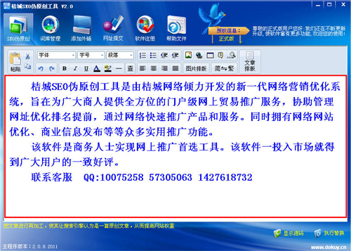 桔城seo伪原创工具官方版是一款用户界面直观清新,非常便捷易用的关键词优化和替换软件。适用范围广,功能强大。能够将文章中的词进行替换,使得伪原创后的文章不会出现僵硬的词汇,而且更贴近于搜索引擎收录和关键字排名。易于上手,十分实用和方便。