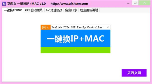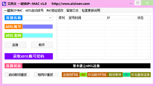 艾西文一键换IP工具官方版是一款美观易用、功能强大的IP更换查询软件,十分实用和方便,简单大方的界面设计让用户一目了然。最主要的功能就是拥有一键换IP地址、一键换mac地址、获取ADSL账号和密码、ADSL自动循环拨号、相同IP自动重拨等功能,无需重启,即时生效!