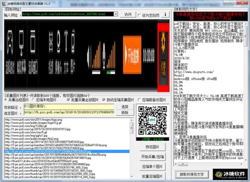 需要采集图片的,这时候点击“开始采集/压缩”按钮即可自动批量采集,图片自动保存到你指定的“存放路径”文件夹下面。当然你也可以选择只下载单个文件,并且可以点击“预览图片”按钮预览待采集的图片文件。为了节约空间,在批量性下载图片的同时,你还可以在“自动压缩采集图片”选项打上勾,那么下载的图片将会被自动压缩(当然图片质量会同步受损),如果压缩之前先备份原图片文件,你还可以在“压缩前备份图片”选项打上勾即可。