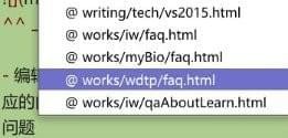 编辑时最后输入的两个字符如果是项目内某个目录或文档的标题内容,则自动弹出智能提示与自动补全菜单,菜单项即为对应的内部链接的地址(@开头)。上下光标键选中而后回车即可。