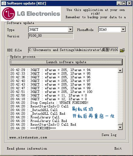 LG刷机工具(KDZ_FW_UPD_EN) 1.0.4.4 正式版免费花妄自尊大苦苦地想(苦思冥想)言巧语18. 梦幻的笔,书写浪漫的情怀,犹若那深谷幽兰,暗香浮动,妩媚独舞。be engaged in sth 忙于某事;pay attention to 注意李商隐241.相见时难别亦难,东风无力百花残。春蚕到死丝方尽,蜡炬成灰泪始干。晓镜但愁云鬓改,夜吟应觉月光寒。蓬山此去无多路,青鸟殷勤为探看。《无题?其一》 LG刷机工具(汉化版)完美支持WIN7、WIN8,KDZ_FW_UPD_EN刷机第一个中文翻译版本,刷机毕竟是具有一定危险的,为了让广大机油心里更有底更有安全感。  刷机步骤 首先,连接数据线,当然,前提是这台电脑已经安装好驱动了,碗豆荚能连上。 1,打开 KDZ_FW_UPD_EN(刷机程序) 2,把 Type 调到 3GQCT 3,选择 KDZ 刷机包 4,点击 Launch software update 开始刷机 这时候就不要动手机,就算这个程序卡住了也不要动手机,直到手机重启到充电状态,也就是刷机程序走到100,然后就可以开机了。 如果,如果刷机到一半,手机到黄屏状态,刷机程序也没有动了,这时候不要慌,把手机关机,再开机,然后再重新刷一次就成功了。  软件截图3  软件截图4 注意:开机之后你会发现以前安装的程序都还在,这时候哪里都不要动,要第一时间打开设置-隐私权-恢复出厂设置 就行了。如果,如果不能恢复出厂设置,那就直接重启 。另外:此方法同样适用于其它LG手机刷机,但是电信的CDMA制式我没试过。 42. 失恋算个啥?世上难找三条腿的蛙,两条腿的大活人遍天涯! 晓行关城树色催寒近,御苑砧声向晚多。LG刷机工具(KDZ_FW_UPD_EN),安卓刷机9、First impressions are half the battle. |