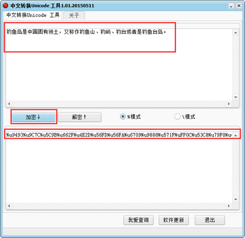 2、若需要中文转换成Unicode,在上方文本框输入要转换的中文,选择【加密】,选择转换模式,在下方文本框就会出现转换后的Unicode