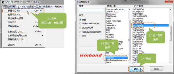 点击软件菜单 [项目/文件]-[新建项目] , 软件将弹出芯片型号选择对话框, 请根据芯片型号选择匹配的型号;