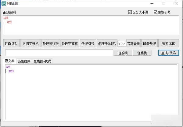 NB正则匹配工具绿色版是一款简单易用的编程软件,NB正则匹配工具绿色版能够给需要的用户带来非常棒的功能,帮助用户轻松处理换行符和空文本,在用户轻松匹配就用的是精易模块的正则表达式类,因为精易编程助手不能处理换行符和空文本,导致有时候在助手里面能匹配出来到易语言里面就匹配不出来了,但是这个工具可以!